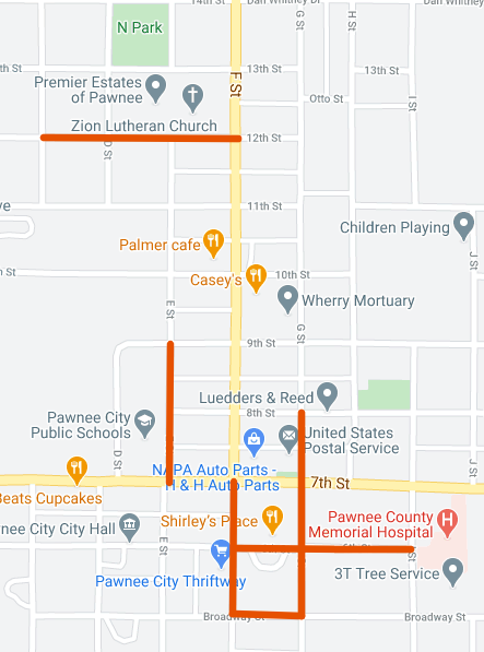 The following streets in the City of Pawnee City, Nebraska are hereby declared to be Snow Emergency Routes.